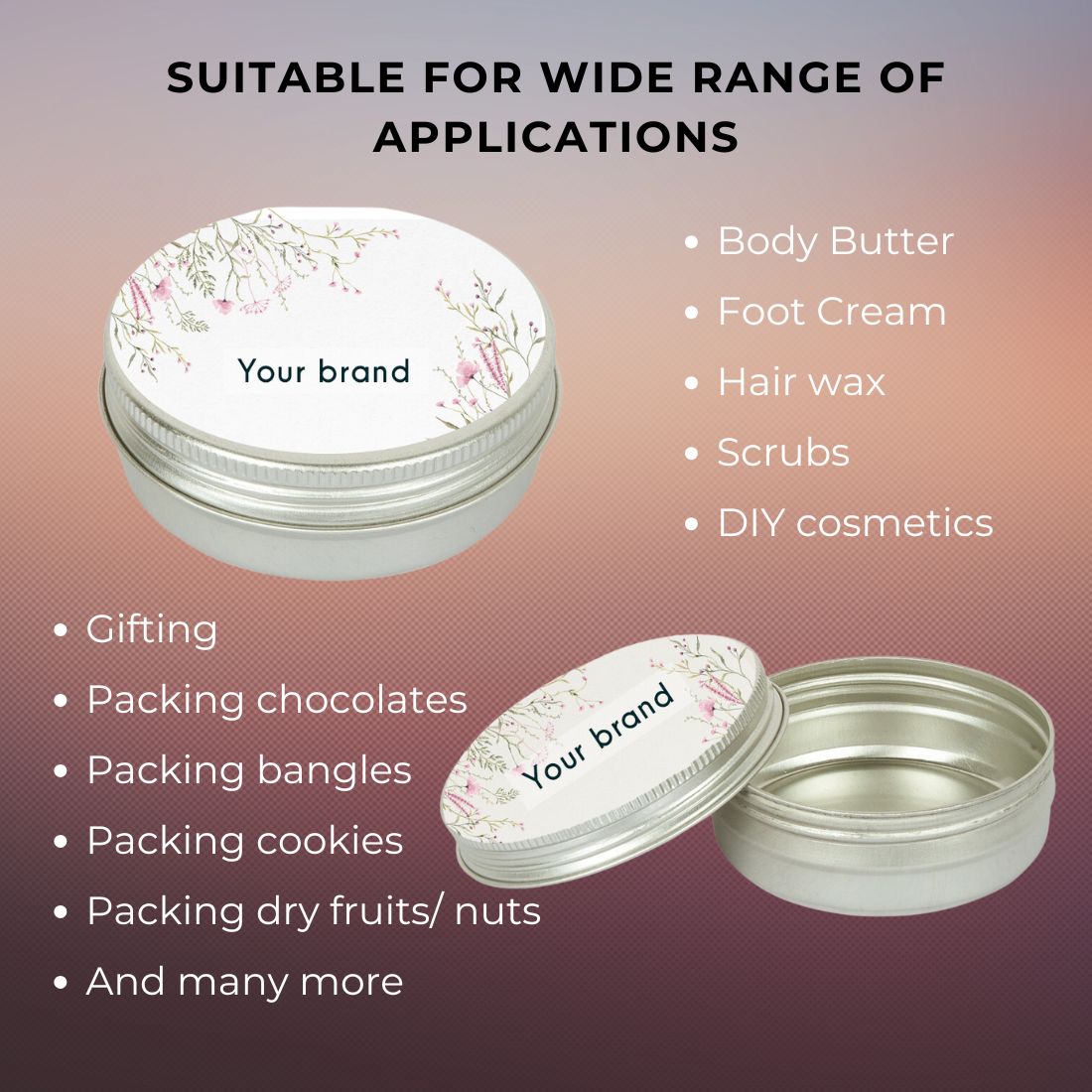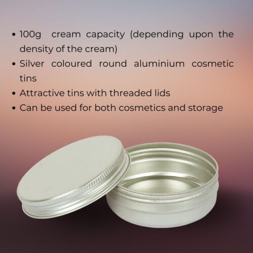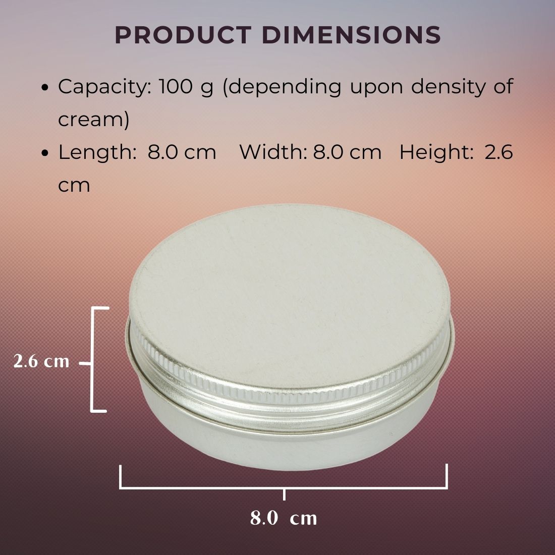 100 ml Aluminium Cosmetic Cream Empty Containers with threaded lid. Ideal for packing creams, hair waxes, balms etc. Plain silver color. Aluminum material. 8.0 cm (dia) & 2.6 cm (height)